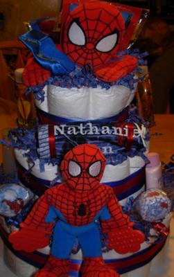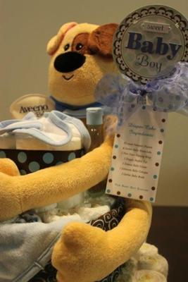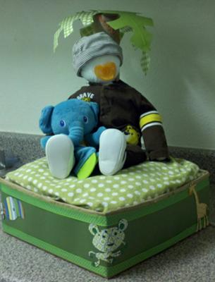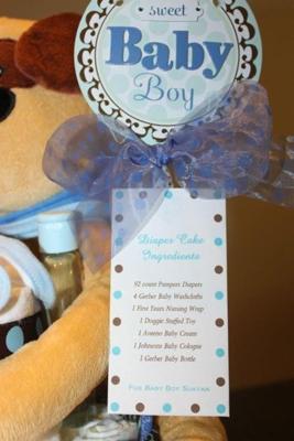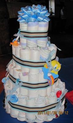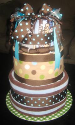 In the case of this diaper cake it was decorated for the baby shower colors of blue, green and brown.