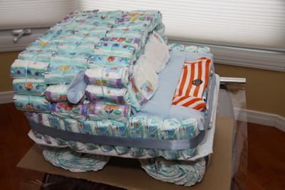 Make three tiers (40, 28, and 17 diapers) and secure them with rubber bands around the outside of each tier.