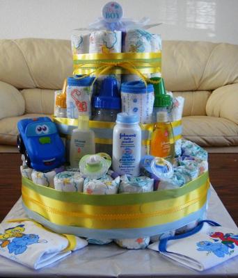 and wrapped and decorated by ribbons. The baby essentials are placed